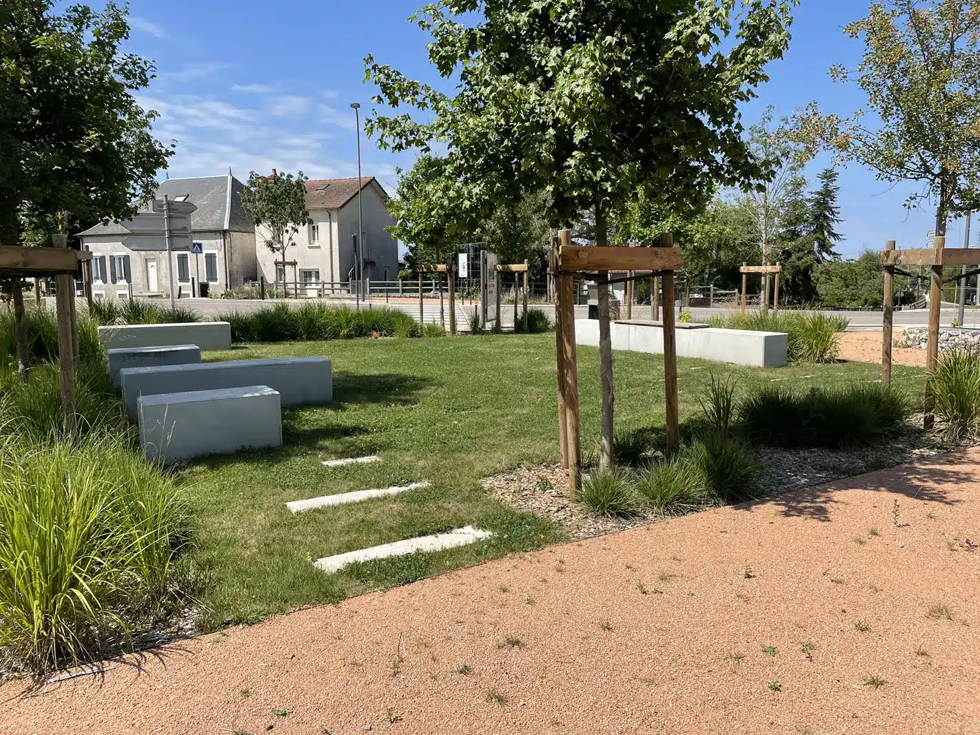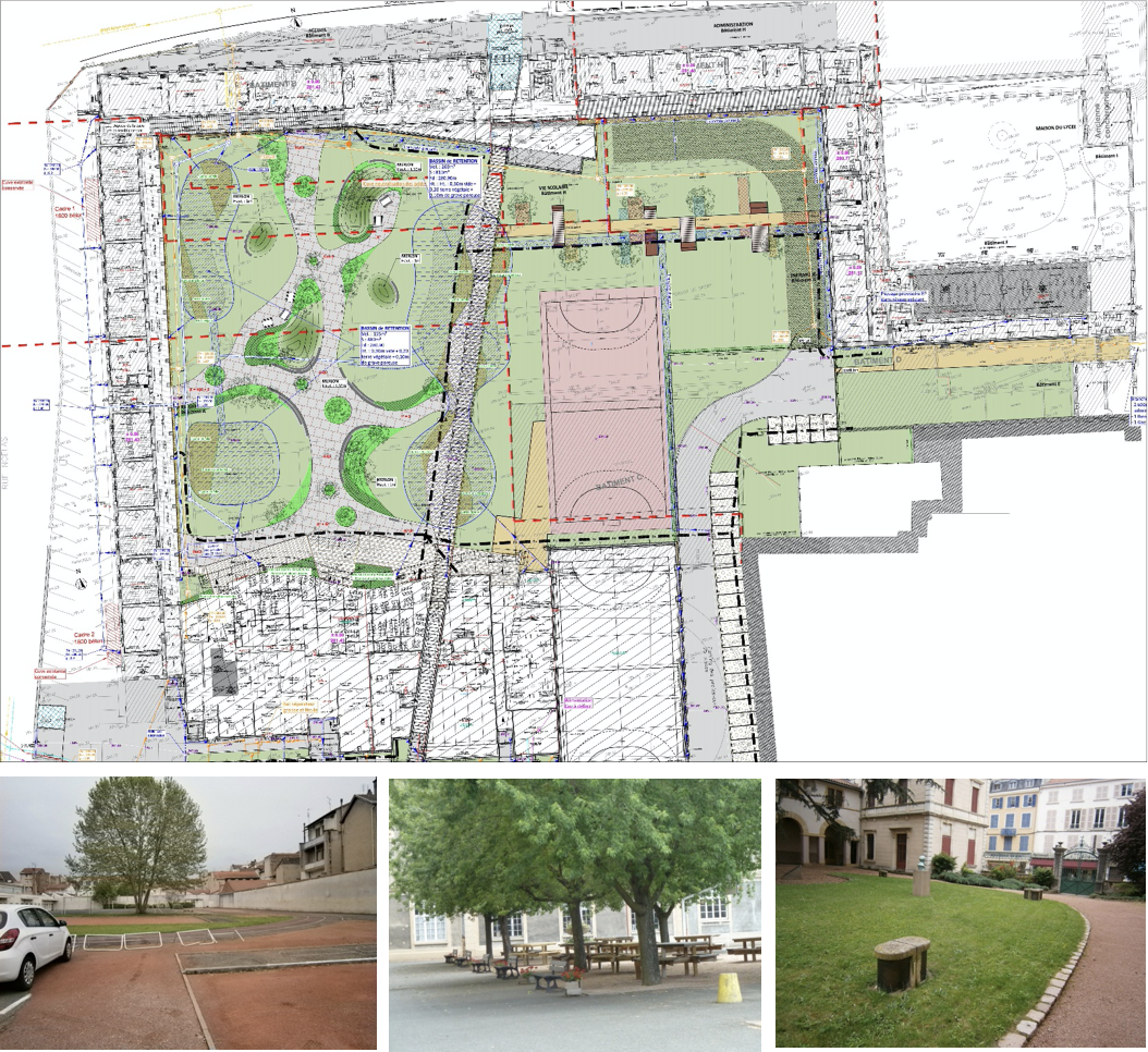 • Traitement qualitatif sur les deux squares avec la création de parvis en béton joints enherbés, des jeux de murets en gabions, des plantations et l’insertion de structures pour grimpantes pour cadrer certains points de vue,