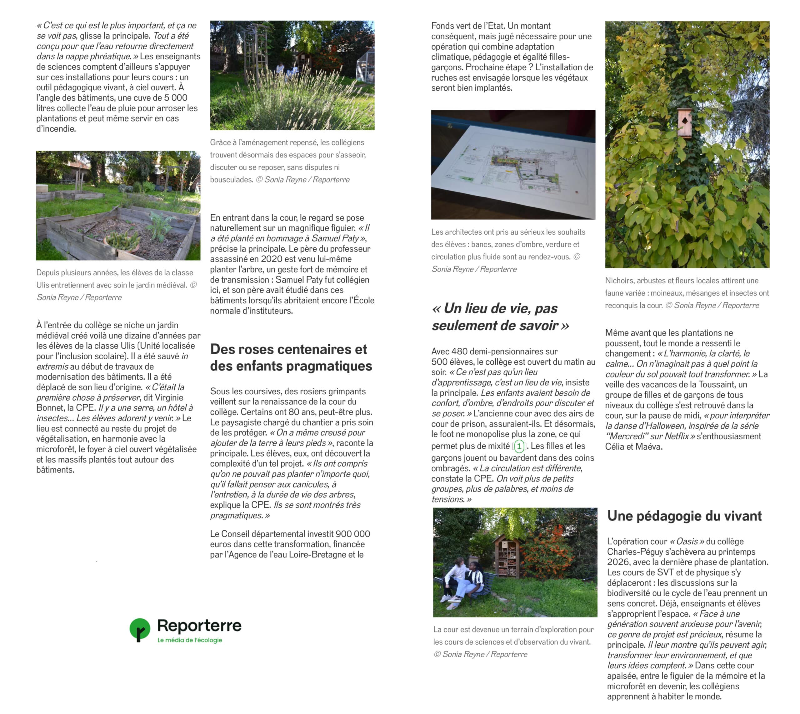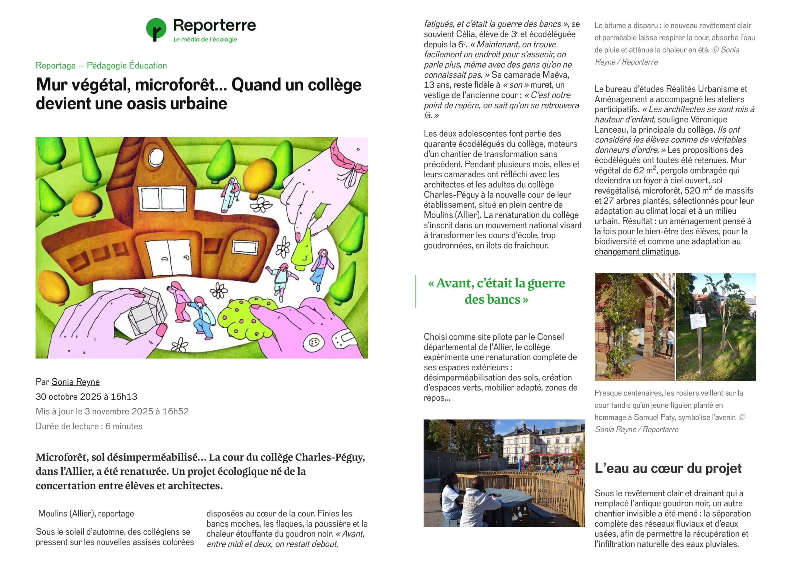Mise en avant des travaux de renaturation de la cour du collège Charles Péguy à Moulins sous maîtrise d’ouvrage du Département de l’Allier par le média Reporterre.