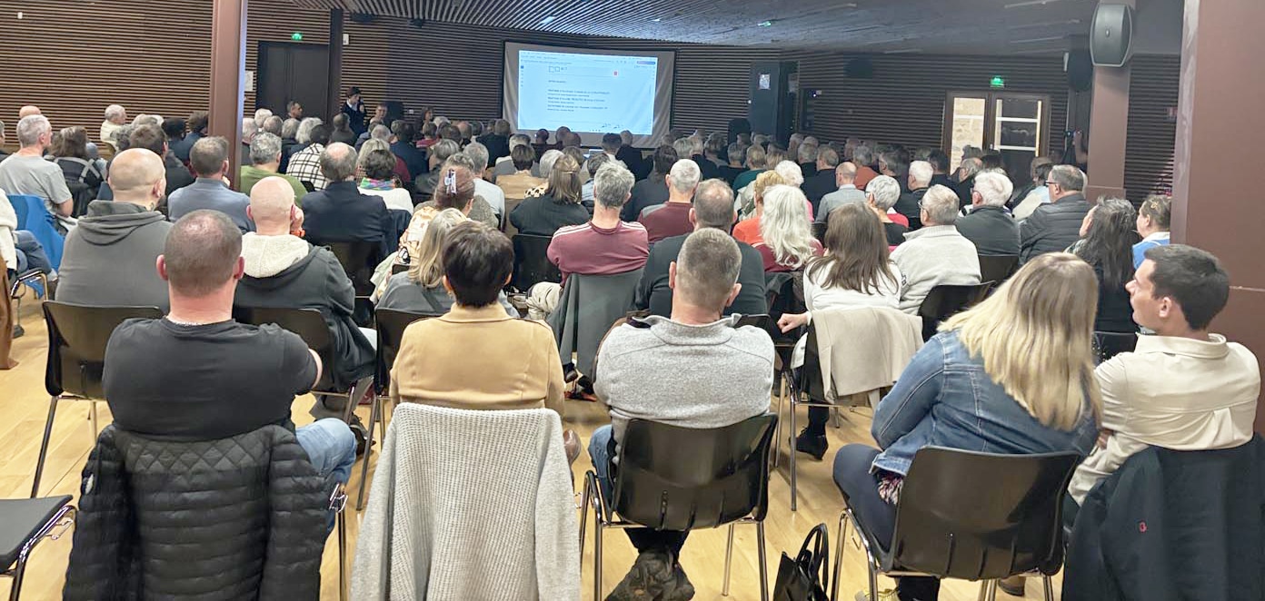 Réunion publique de présentation des travaux d’assainissement et d’adduction d’eau potable ainsi que de l’aménagement des espaces publics du centre-ville de Chauffailles avec 150 personnes environ et la présence de Brionnais TV.