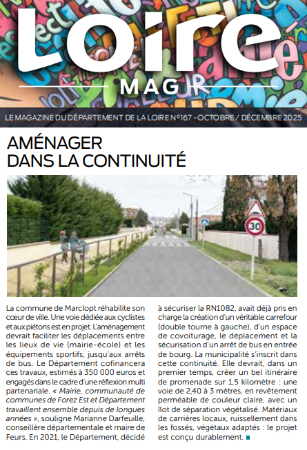 Mise en avant du projet d’aménagement d’une voie modes doux à Marclopt dans « Loire Mag », le magazine du Département de La Loire.