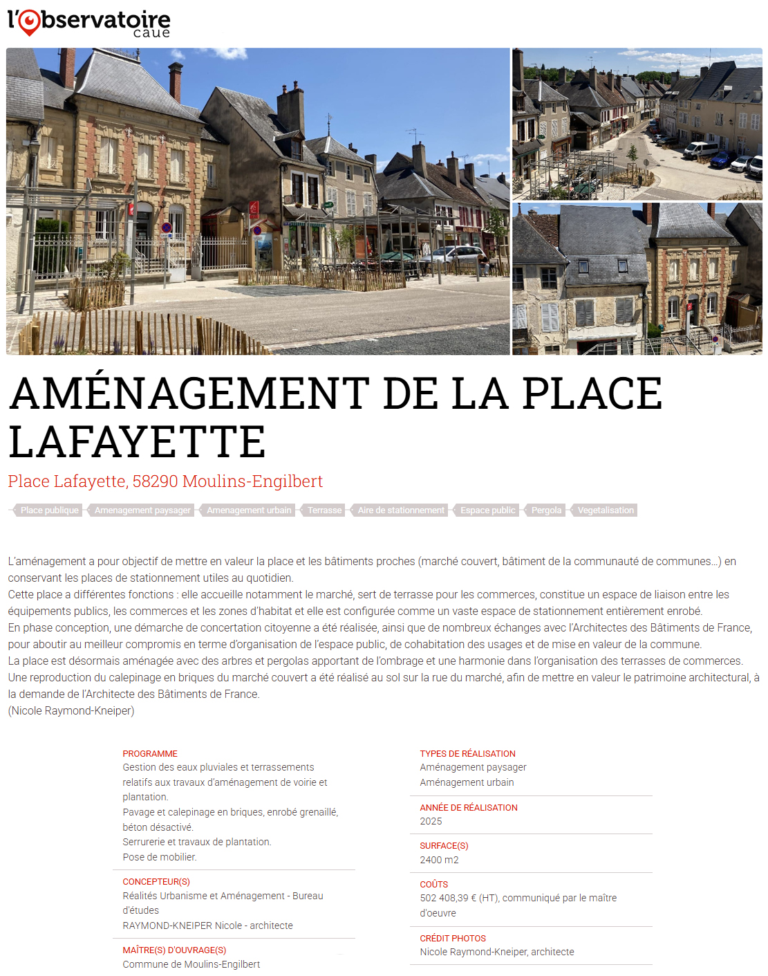 Mise en avant de l’aménagement de la Place de Lafayette à Moulins-Engilbert par l’Observatoire CAUE. Réalités a réalisé la conception paysagère et technique du projet, l’Architecte Nicole Raymond-Kneiper a réalisé le suivi des travaux.