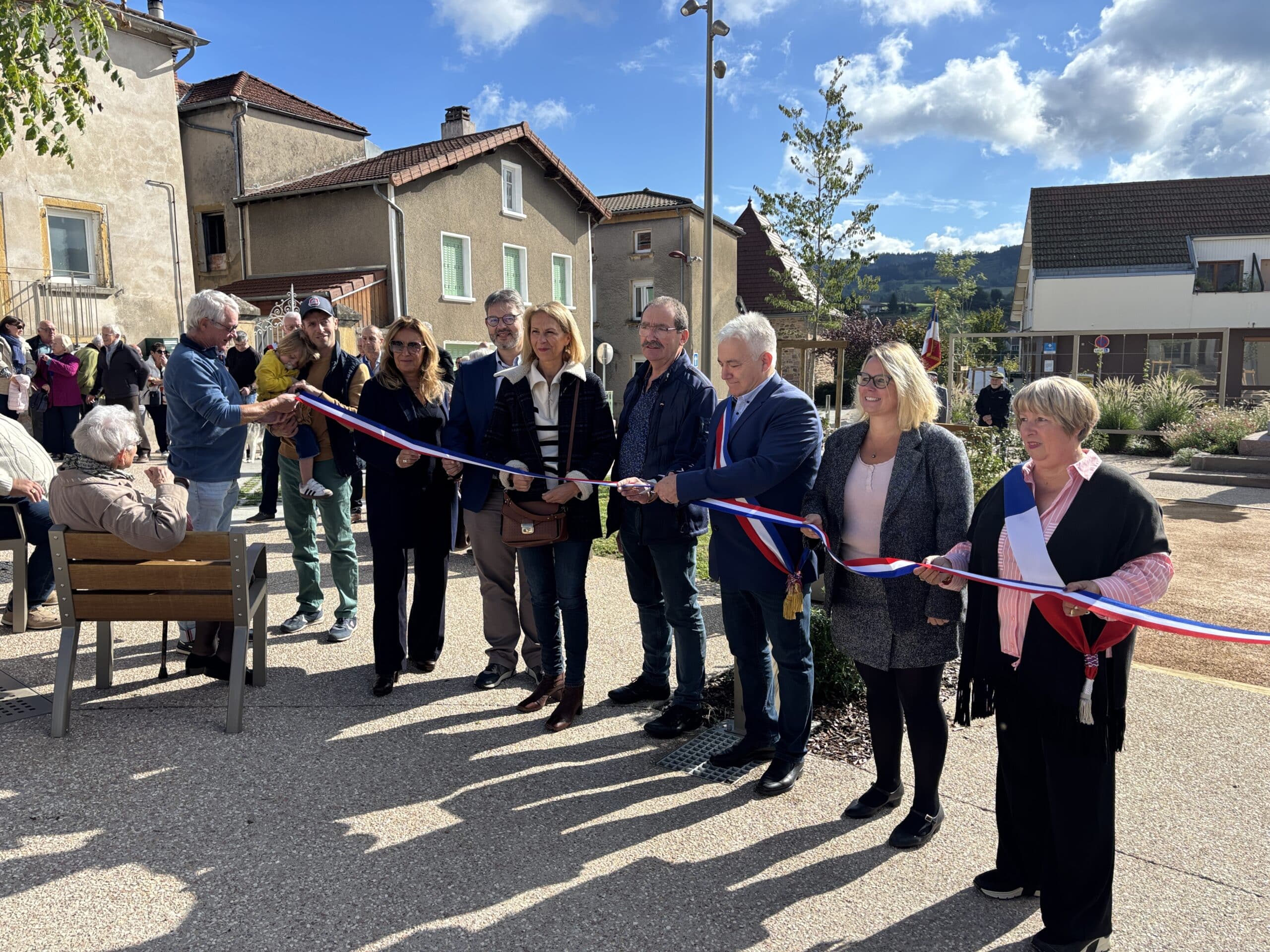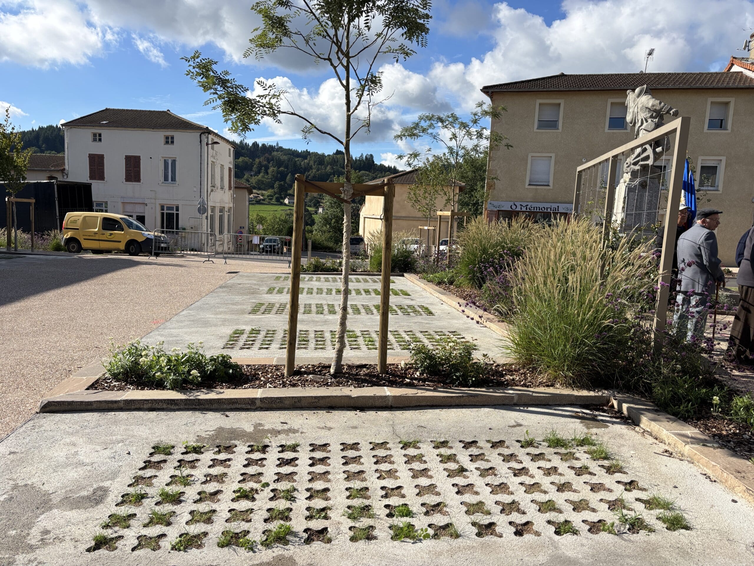 Inauguration du nouvel aménagement de la Place du Souvenir à Belmont-de-la-Loire. Objectifs atteints de mise en valeur du centre-bourg avec la désimperméabilisation du site, la création d’un espace vert et la plantation d’une dizaine d’arbres pour limiter l’échauffement l’été, le maintien d’espaces de stationnement suffisants.