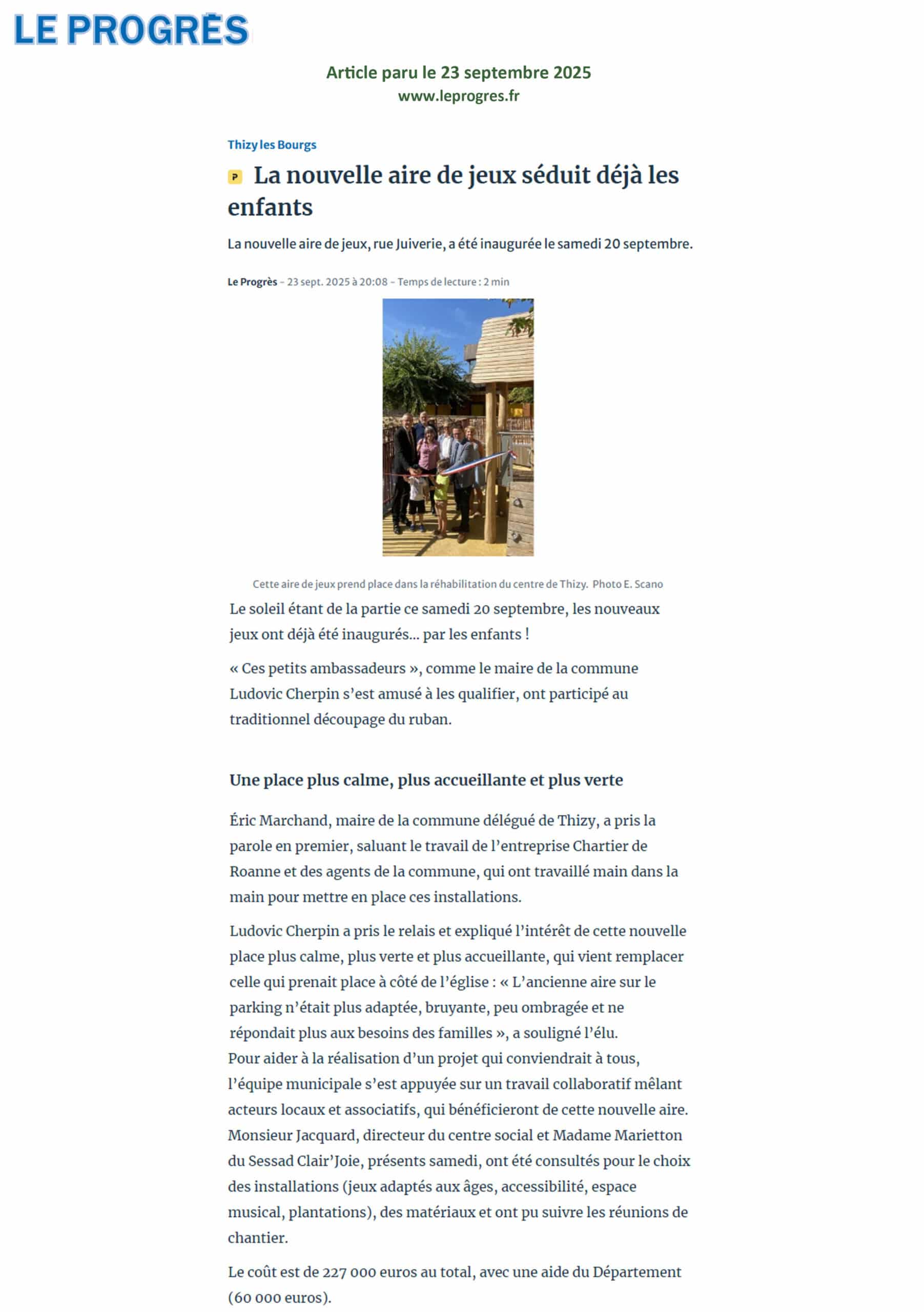 Inauguration de la nouvelle aire de jeux à Thizy-les-Bourgs qui s’est réalisée en concertation avec le centre-social et le SESSAD.